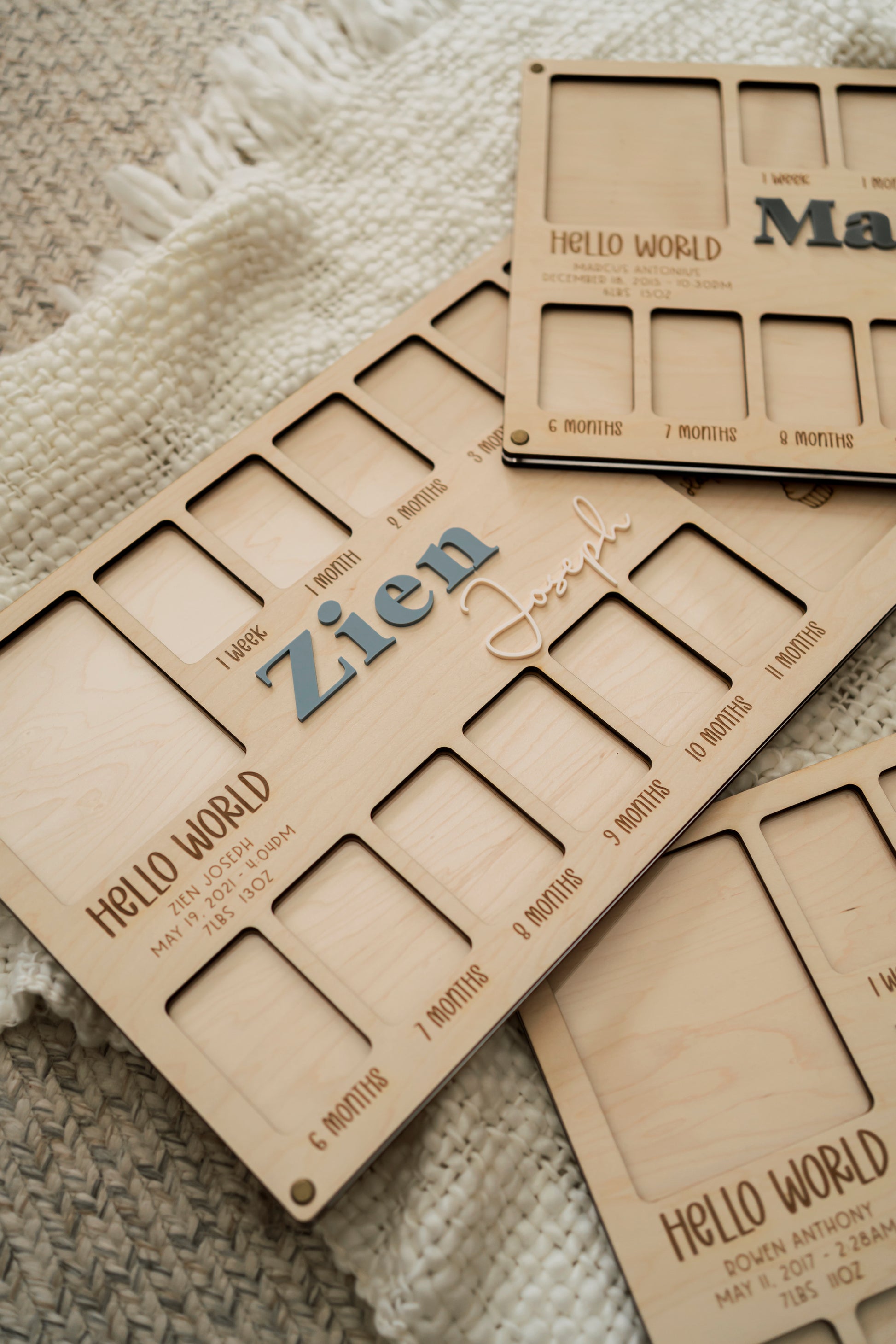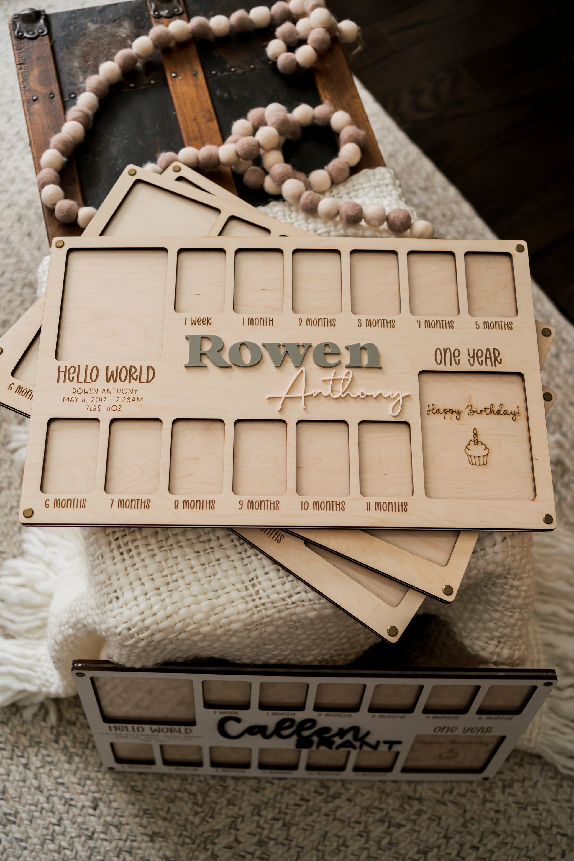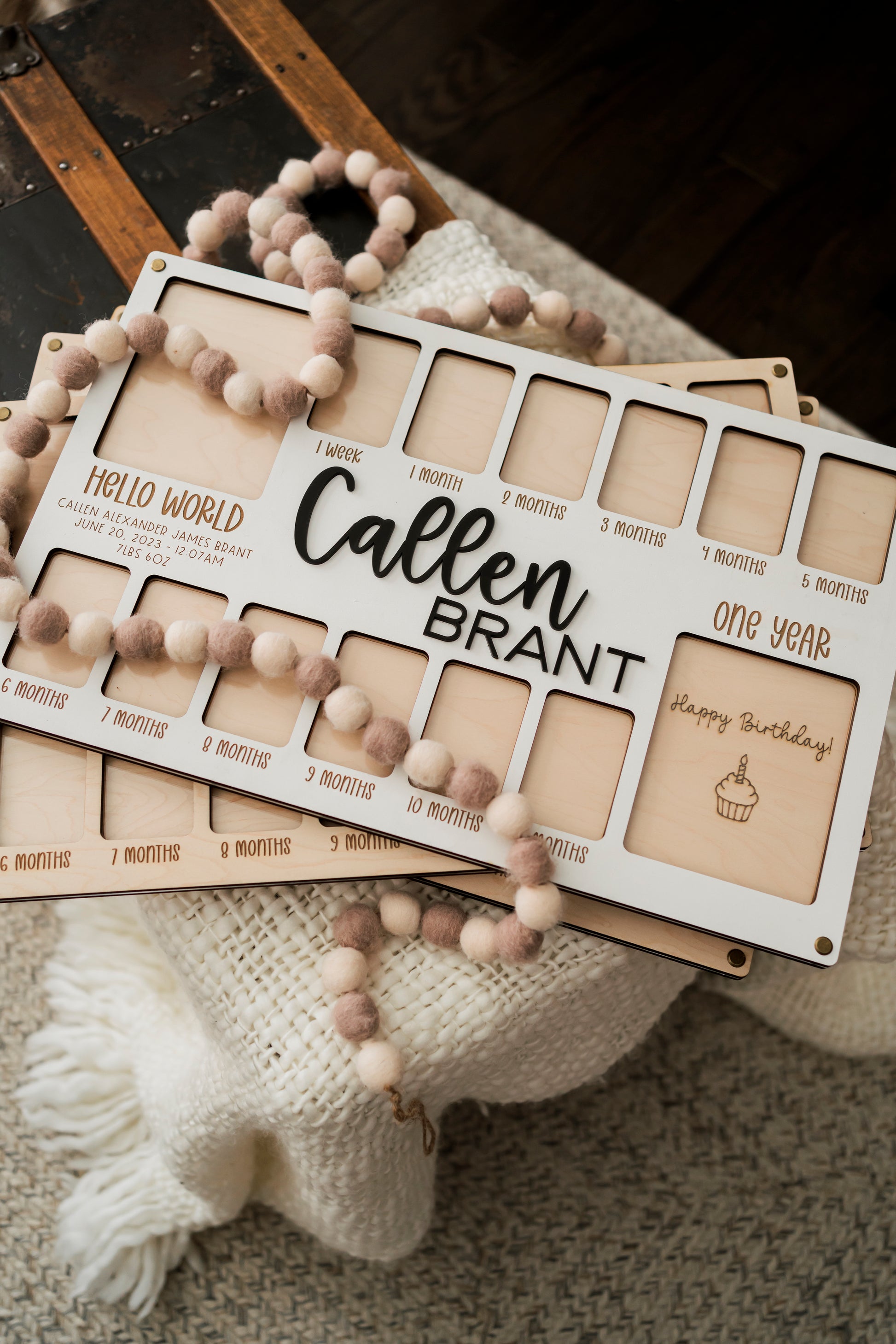 Celebrate every moment with Baby's First Year Picture Frame. This frame is crafted with love and has a playful design that is perfect for displaying your little one's milestones throughout their first year. Personalize with their name, 3 colour choices for the frame and fonts and colour styles. Cherish these precious memories and add a touch of whimsy to your decor.