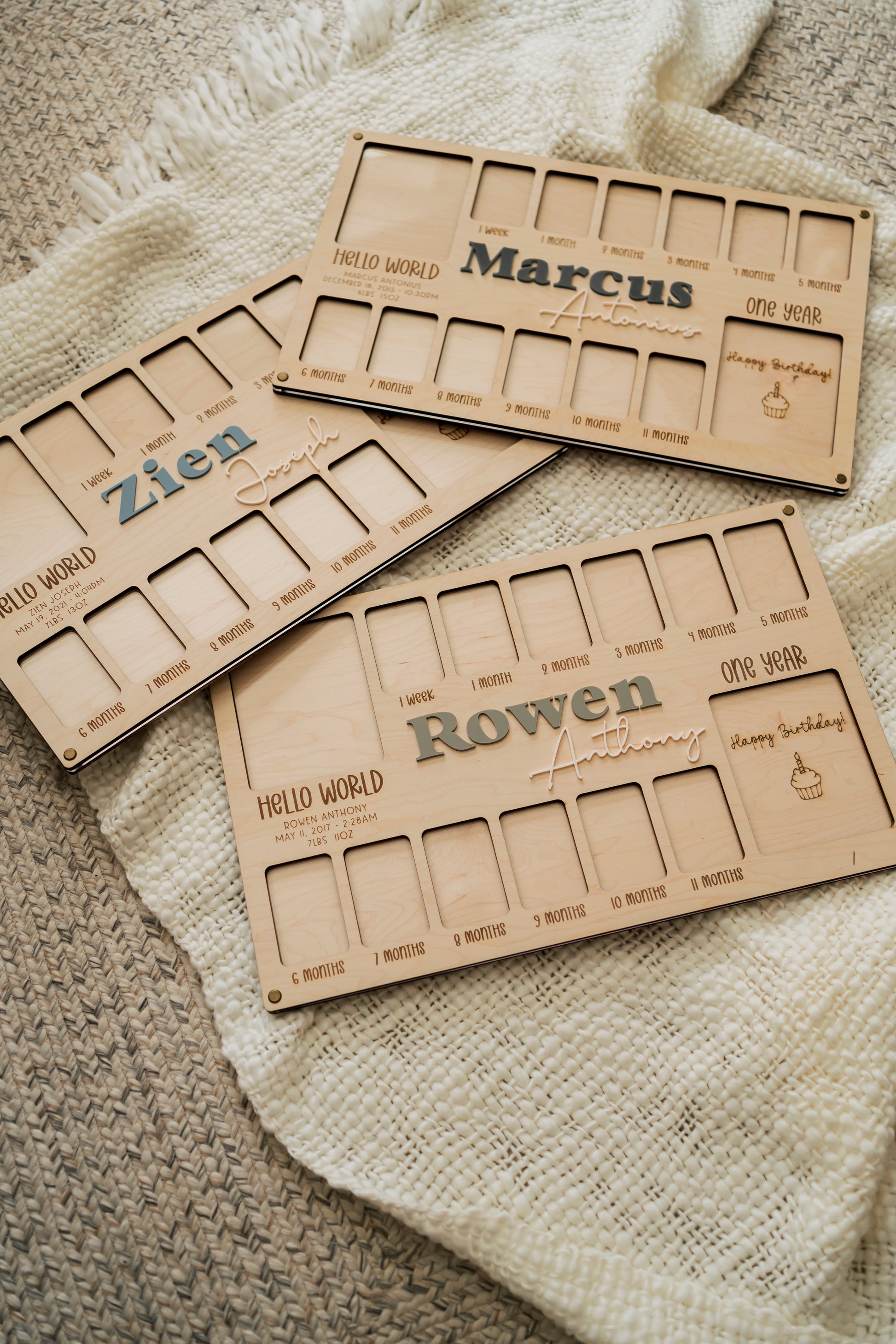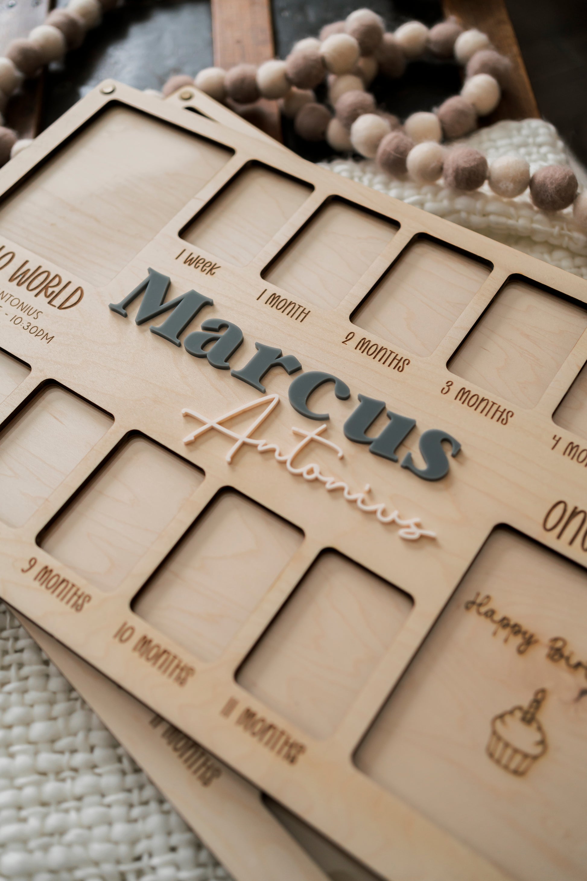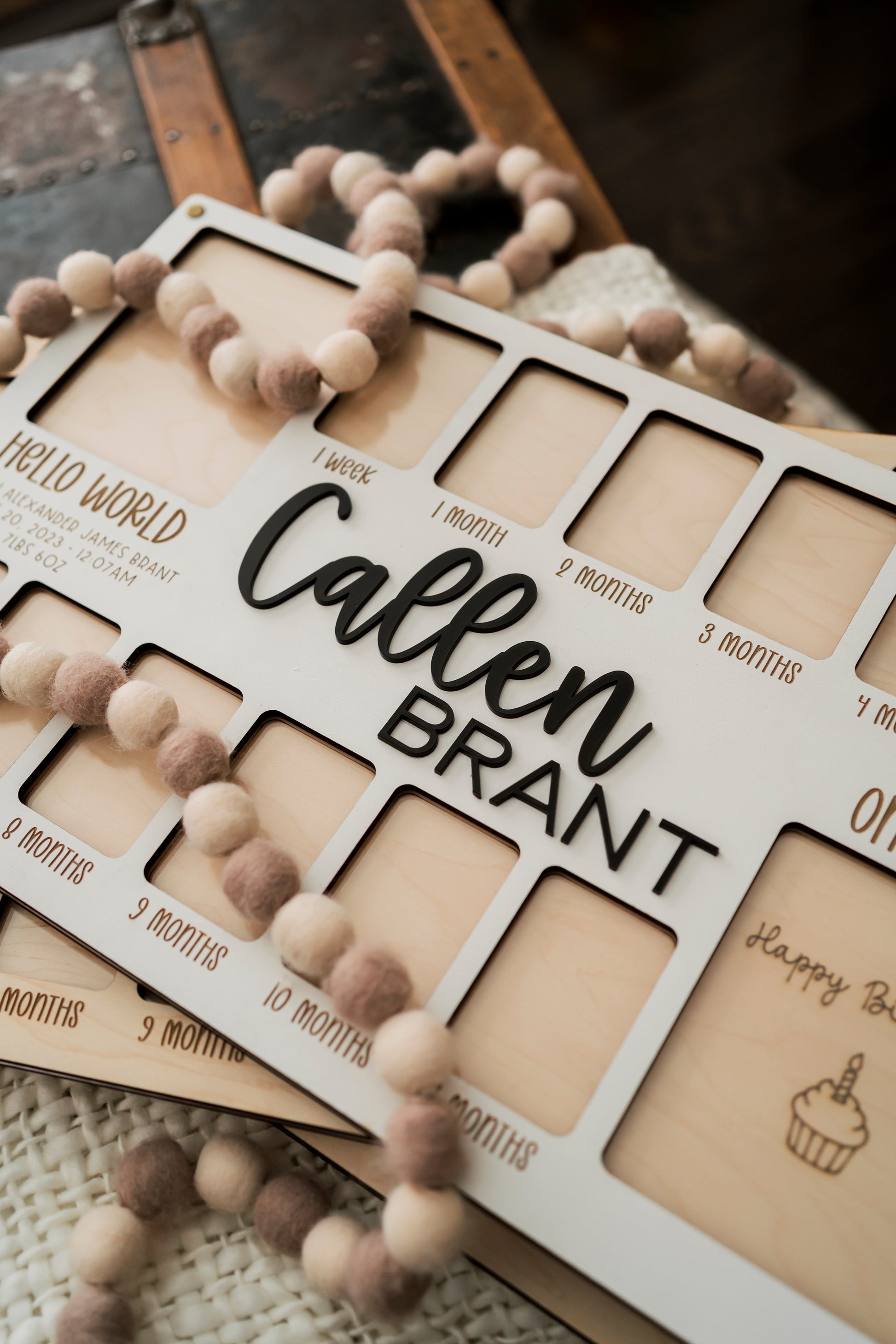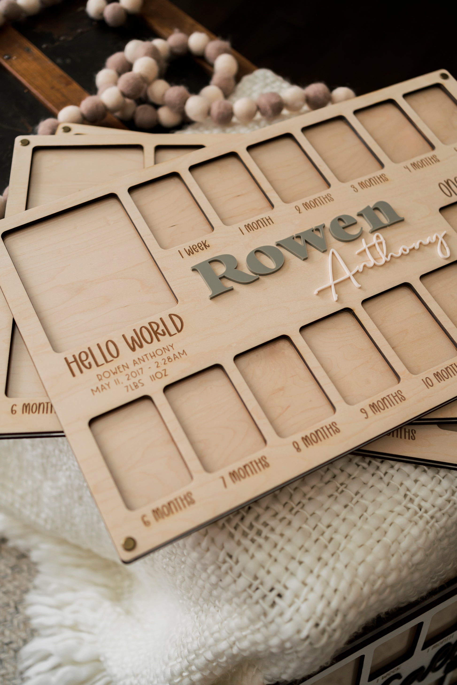 Celebrate every moment with Baby's First Year Picture Frame. This frame is crafted with love and has a playful design that is perfect for displaying your little one's milestones throughout their first year. Personalize with their name, 3 colour choices for the frame and fonts and colour styles. Cherish these precious memories and add a touch of whimsy to your decor.