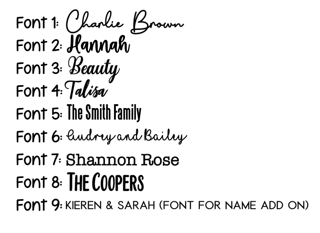 Choose font (if choosing Name option)and colour and add details in notes at check out.