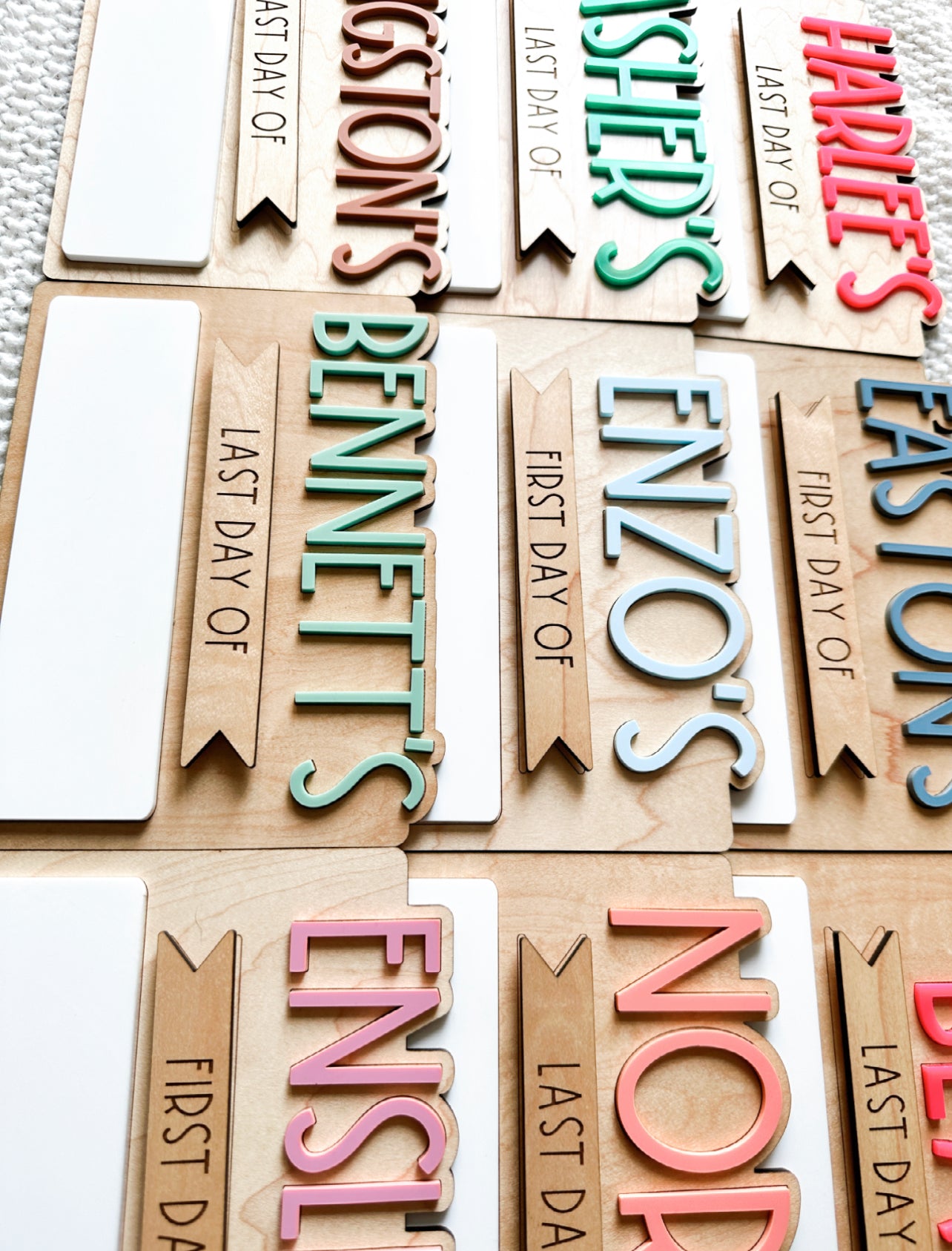 These adorable Personalized first/last day of school are great for picture props. Comes with erasable panel for reuse.