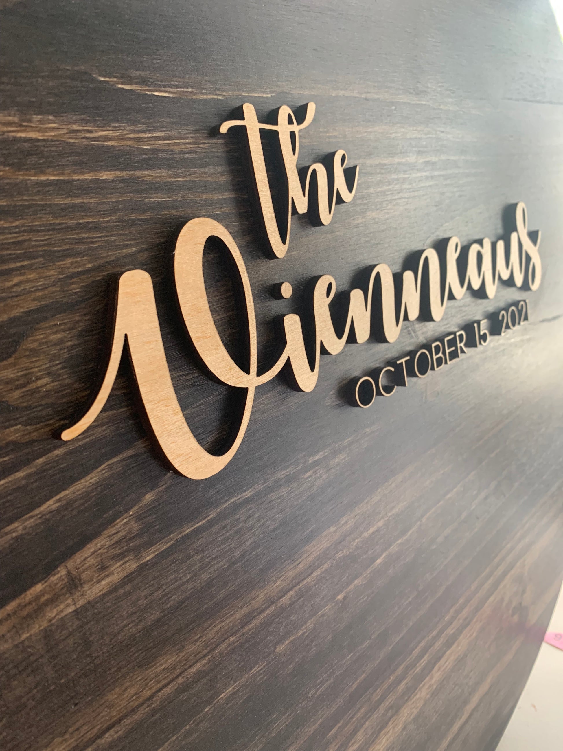 **Include names and date in notes at check out. I will send a digital design for your approval within 4-5 days of purchase to confirm names and date and font style. Please take care to double check the personal information on the design to ensure that everything is correct and nothing is misspelled as this will be the spelling and date that is made for your sign.